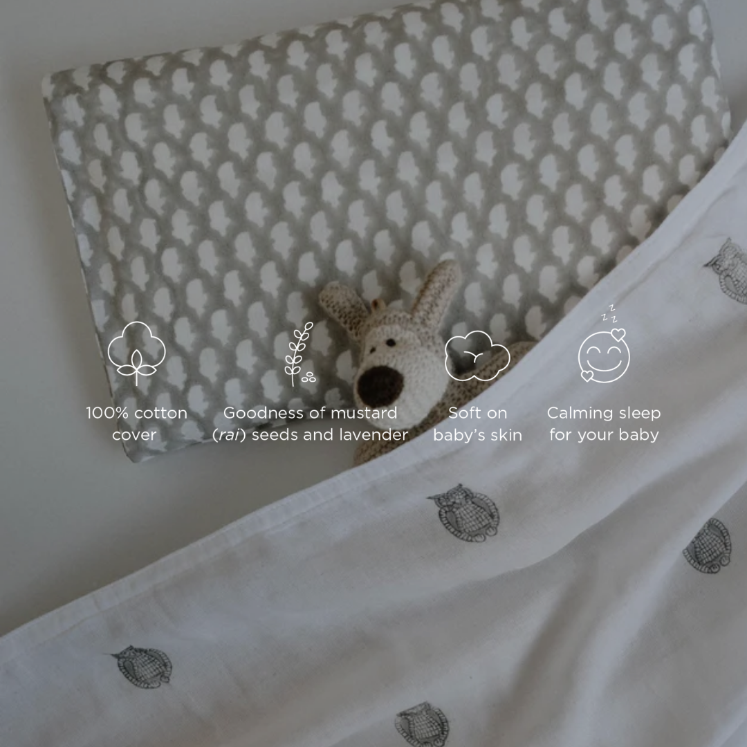 Filled with soothing dried lavender and mustard (rai) seeds, the pillow insert gently contours to your baby's head, providing support and cushioning.
