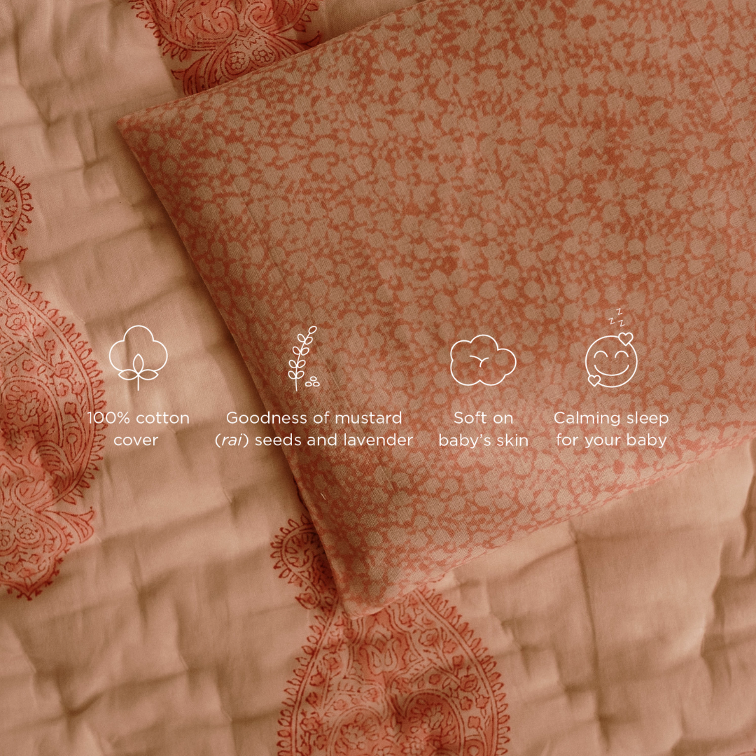 Filled with soothing dried lavender and mustard (rai) seeds, the pillow insert gently contours to your baby's head, providing support and cushioning.
