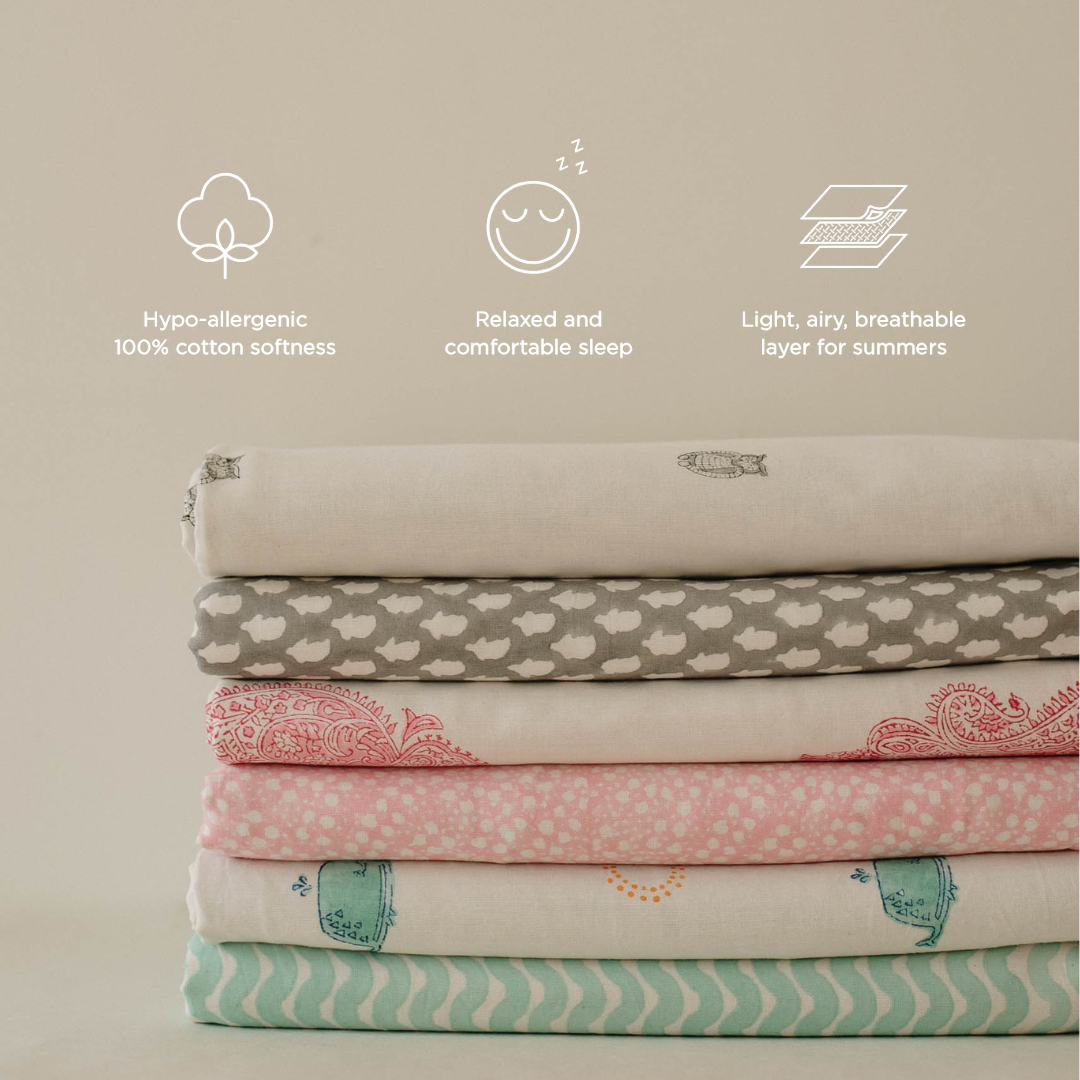 The reversible Orchid baby dohar is hand block printed with different intricate pastel pink boutis on both sides. This is part of our Bloom Baby Collection and is inspired by flowers that encourage happiness and intimacy between the child and the mother. Made for gentle snuggles, the Orchid Baby Dohar is soft, breathable, and light as air.